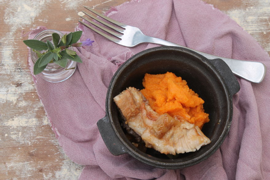 Serve with seasonal vegetables, I have served it with a carrot, pumpkin and sweet potato puree here, cooked in the thermomix basket and then pureed with a little butter and salt and pepper.