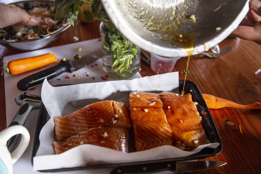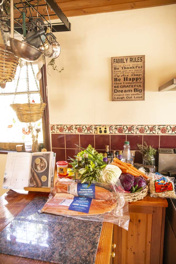 Seriously delicious meal cooked at Old School Kitchen Kids cooking classes this week we used the recipe from Seafood Everyday to marinade the fish and then make the salad and dressing. Maggie has requested it for her birthday dinner it was so good! Honestly I would pay $35 or more for a serve in nice cafe!! And a big thanks to Tassal for supporting the classes providing the salmon for the kids and their families. A chance meeting with a friend who works at the Tasmanian Salmon Association in the isle of Officeworks right back when I was just at the putting the offer in on the house stage, yonks ago, chatting about my kids cooking class and adult basic cooking class ideas has led to Tassal donating the fish and supporting these classes. While I always have and will always buy salmon and other seafood for my workshops it’s not really in the budget for this $65 dollar a person class that includes a take home meal for 4 , unfortunately. I love teaching to cook but I have a business to operate my own family to feed. I do know very well from years of experience teaching workshops the best way to get someone to cook something again is to show them. I would be very surprised if the dishes we cook in the classes are not cooked at home again. I know a lot of people still don’t cook seafood as they think it’s too hard. My husband Brendan being a fisherman also provides some scale fish so we can have seafood on the menu at least a few times each term.