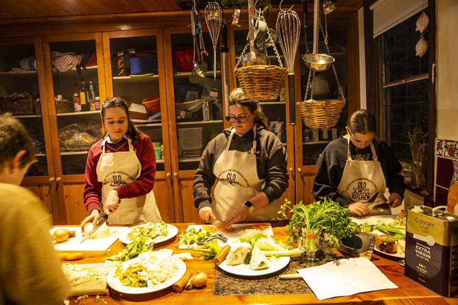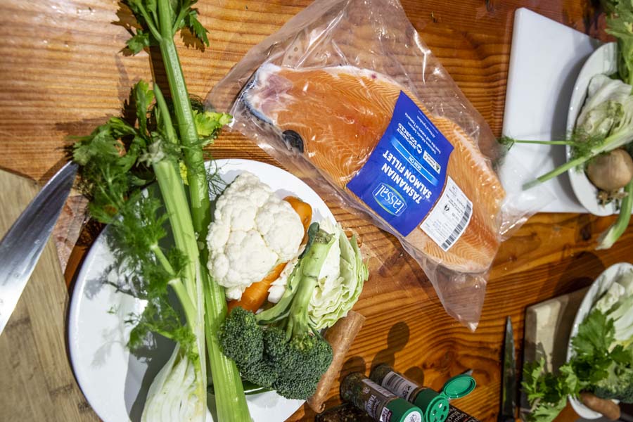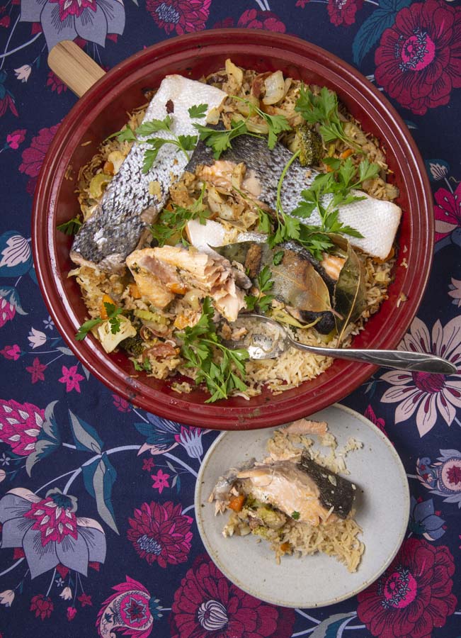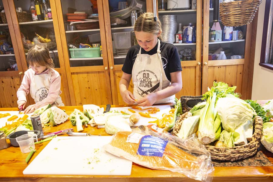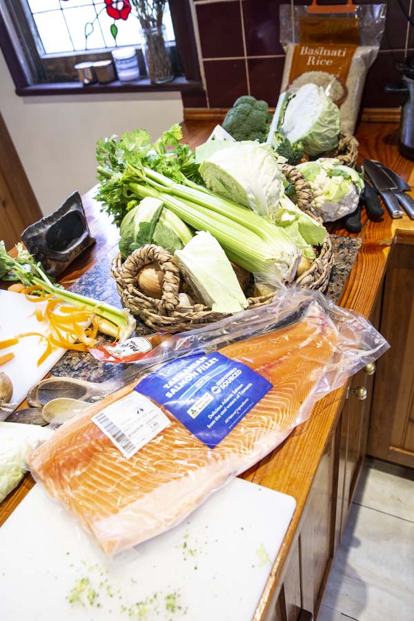 This week at our Old School kitchen Kids cooking class we made a delicious one tray Tassal salmon pilaf, the recipe is in ‘Celebrate’ cookbook, we tweaked it with extra veggies for a weeknight family meal. It really was delicious. I always recommend Salmon to anyone that may be a bit nervous cooking seafood. Salmon is a good choice it can be served medium all the way through to well done without hurting it too much. So, you can’t really muck it up. I did notice when I was in the Salmon Shop Salamanca, that they had a special on for frozen pieces for $15.50 a kilo (I think). The frozen pieces would be fine in this baked Pilaf. An economical seafood family meal if you are watching your budget. It made it into the kids thermoses today too. It is thermos season, my kids have had many people comment on their fancy lunches but heating leftovers and shoving it into a thermos is about as easy as it gets for a packed lunch!