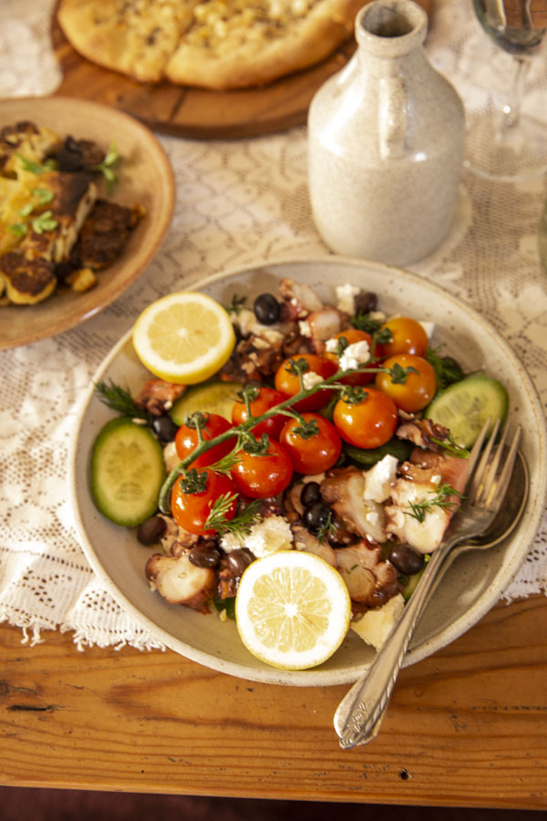 The guests arrived to freshly baked scones made from the recipe from the Real Food for Kids cookbook, raspberry and apricot jams I had made in summer and cream and coffee and tea. Then we made bread, pasta, filleted fish, cleaned octopus, shucked oysters and then the guests enjoyed a lunch of all our delicious cooking.