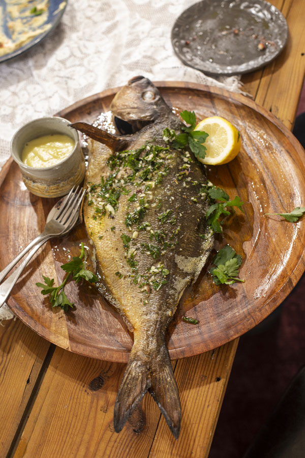 Baked Bay Trumpeter, lemon and oregano dressing and skordallia Recipe from Seafood Everyday