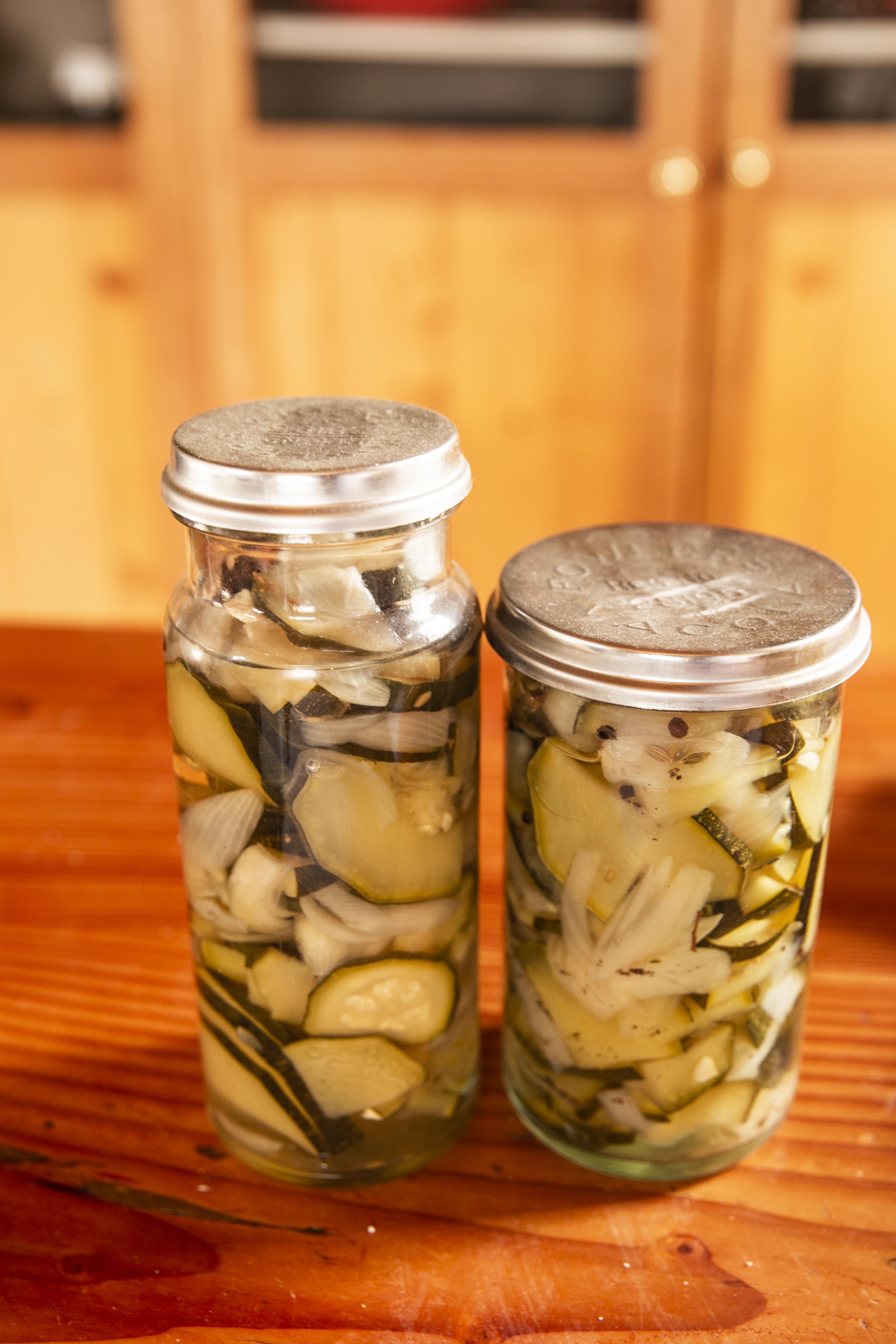 Pickling liquid as a rough guide is 3 parts vinegar: 2 parts water: 1 part sugar plus salt and spices. The liquid can be boiled on the stove until the sugar dissolves or all just poured on top of the zucchini and hope it dissolves in the preserving unit when it comes to the boil. Jars with well-fitting lids could also work if the zucchini is cooked in the liquid first- but I have not tried this.